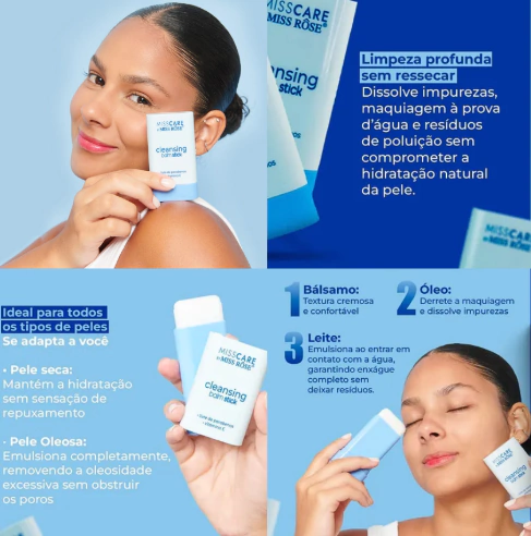 Cleansing Balm em Stick! Com um formato inovador, ele remove impurezas e até as maquiagens mais resistentes, sem ressecar a pele. Sua fórmula transforma-se em três fases – bálsamo, óleo e leite – garantindo uma limpeza eficaz sem comprometer a hidratação natural.